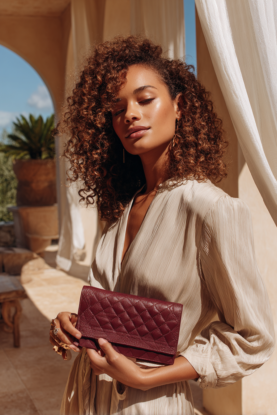 A quilted clutch in burgundy is the perfect accessory for a night out or a chic day event. The structure of a clutch lends refined elegance, making it an ideal choice for pairing with both casual and dressy outfits. Its compact size ensures that you can carry the essentials while maintaining a streamlined silhouette.